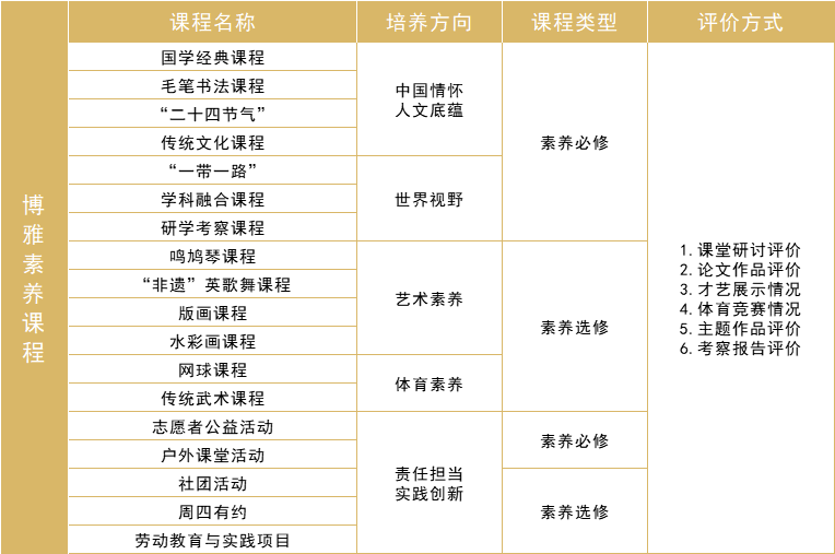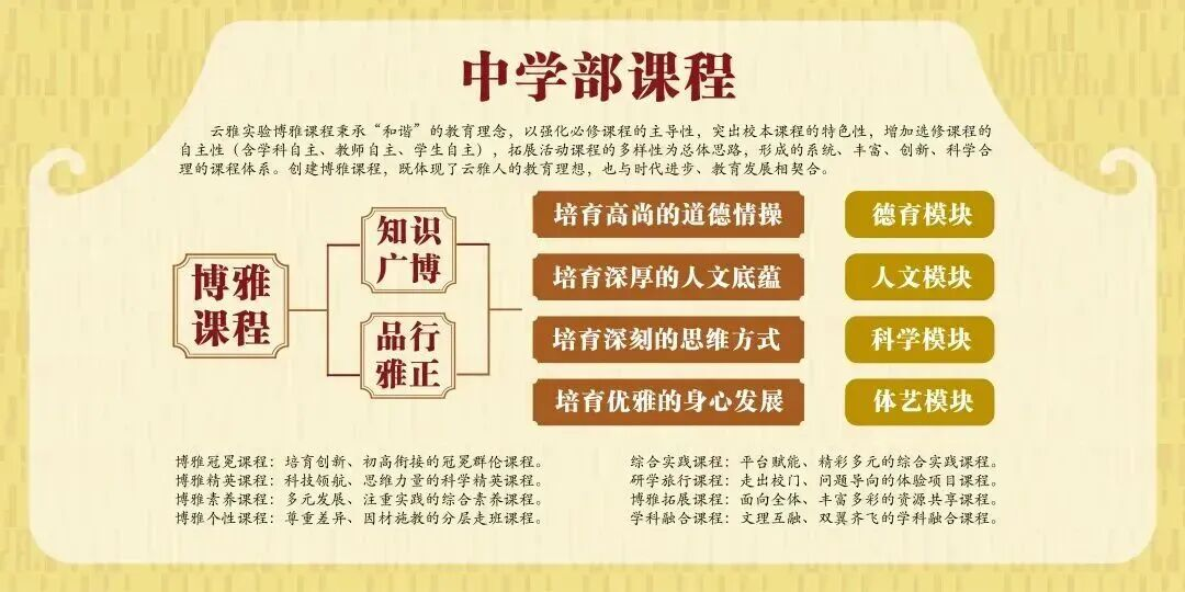 课程体系:构建了博雅冠冕课程、博雅精英课程、博雅素养课程、博雅个性课程、博雅融合课程、博雅拓展课程、研学旅行课程、综合实践课程等特色课程,满足不同层次学生的多样性需求。