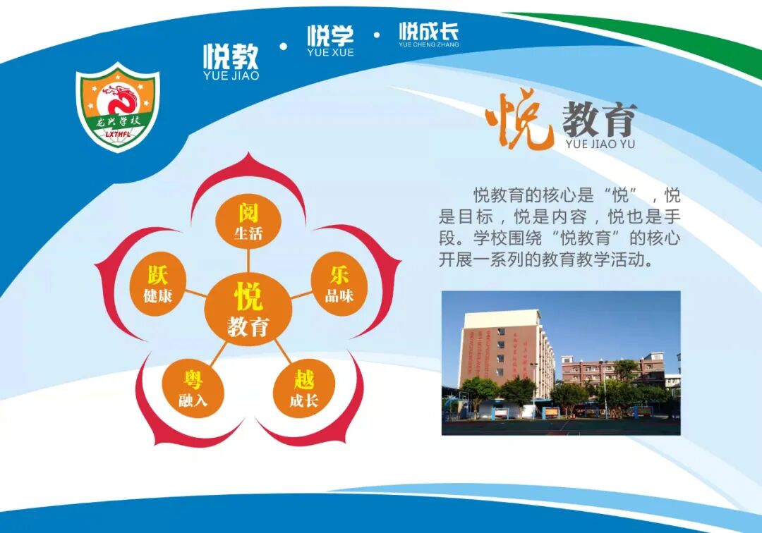 我校以“悦教育”为核心,将教育延伸至“阅生活”、“乐品味”、“跃健康”、“粤融入”、“越成长”、“悦课堂”,基于国家课程和校本课程,用丰富多彩的活动作为载体,培养孩子良好的学科素养和艺术、人文、科学的兴趣,让每一个学生都得到充分而自由的发展。